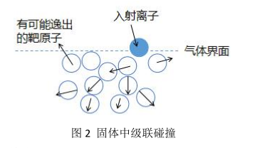 所謂濺射就是用荷能粒子(通常是惰性氣體的正離子)去轟擊固體(簡稱為靶材)表面,從而引起靶材表面上的原子(或分子)從其中逸出的一種現(xiàn)象。濺射的機理是動量從碰撞的粒子(正離子)傳遞給晶體點陣粒子的過程。如圖2所示,入射離子的動能傳遞是接連不斷地從一個原子傳遞給另一個原子的過程。