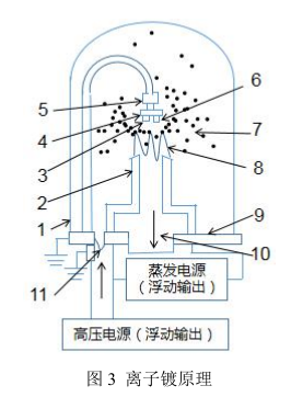 真空離子鍍膜是指在真空氣氛中利用蒸發(fā)源或濺射靶使膜材蒸發(fā)或濺射,蒸發(fā)或濺射出來的一部分粒子在氣體放電空間中電離成金屬離子,這些粒子在電場作用下沉積到基體上生成薄膜的一種過程 。其原理如圖3所示 。首先將鍍膜室壓力抽真空至 10 -3pa 以下,然后通入工作氣體使壓力增大至 10^0-10^-1pa,接入高壓。由于作為陰極的蒸發(fā)源接地,基體接入可調(diào)節(jié)的負偏壓,這時電源即可在蒸發(fā)源與基體間建立起低壓氣體放電的低溫等離子區(qū);電阻加熱式蒸發(fā)源通電加熱膜材后,從膜材表面上逸出來的中性原子,在向基體遷移的過程中通過等離子體時,一部分原子由于與電子碰撞而電離成正離子;另一部分與工作氣體中的離子碰撞交換電荷后也可生成離子。這些離子在電場作用下被加速而射向接入負電位的基體后,即可生成薄膜。